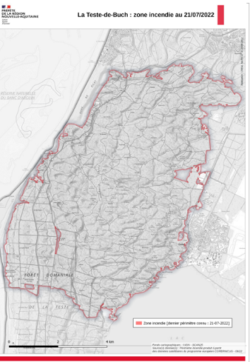 Une première réponse a consisté à produire une carte des contours de l’incendie en s’appuyant sur les données de terrains fournies par le GIP ATGeRi et le SDIS 33 (Service départemental d’Incendie et de Secours de la Gironde). La MICAT s’est également appuyée sur les images satellites SPOT dans le cadre du dispositif COPERNICUS (programme d’observation de la Terre de l’Union européenne) pour la mise à jour régulière de l’évolution de la situation in situ.