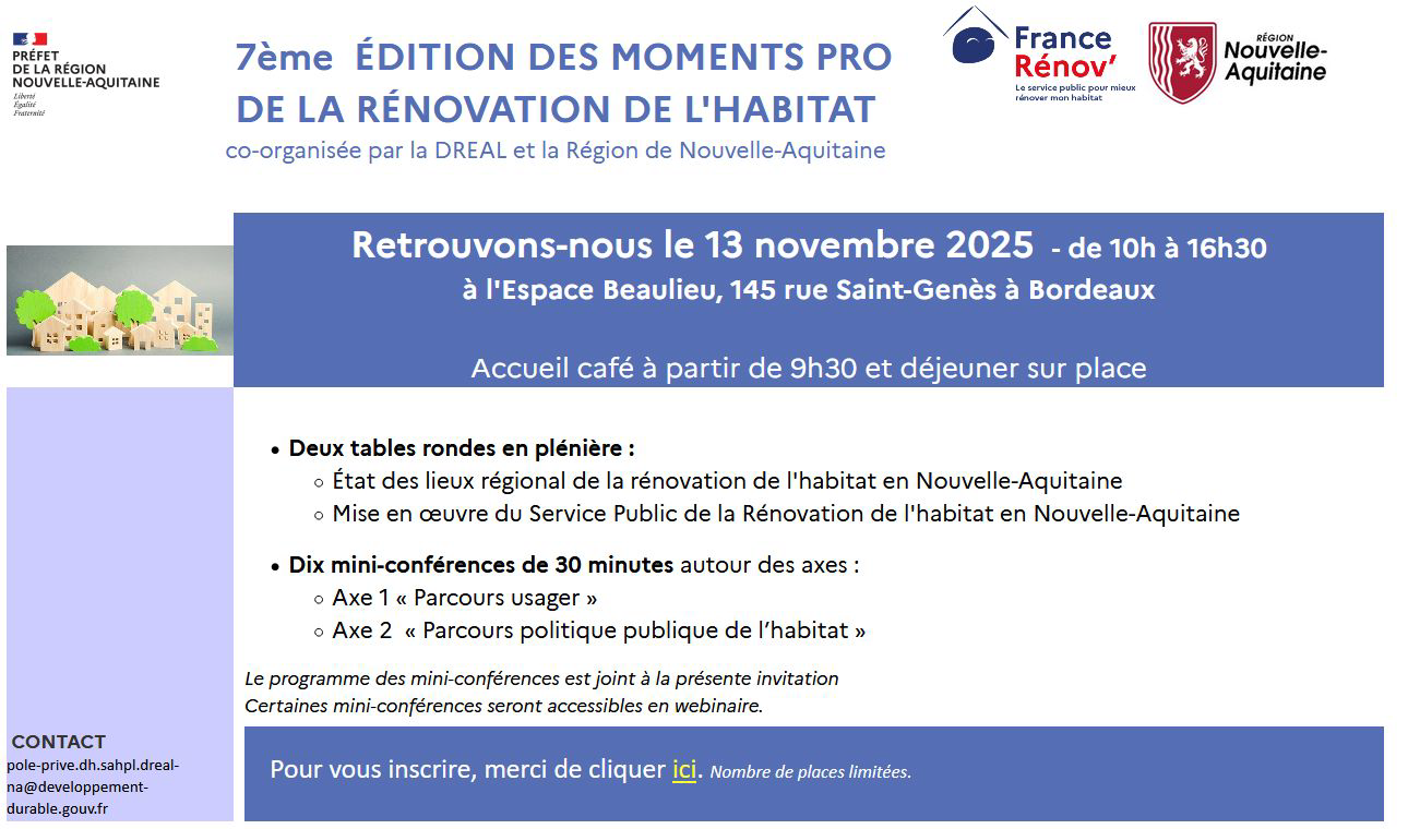 Rendez-vous le 13 novembre à Bordeaux pour la septième édition de Moment Pro, organisé par la DREAL Nouvelle-Aquitaine, en partenariat avec la Région et l’ANAH. Les acteurs de la rénovation de l’habitat se donnent rendez-vous autour des grands enjeux de la rénovation de l’habitat privé et du service public France Rénov’. Au programme : deux plénières consacrées à l’état des lieux de la rénovation dans la région et à France Rénov’ et 10 conférences présentant des retours d’expériences dans la région.