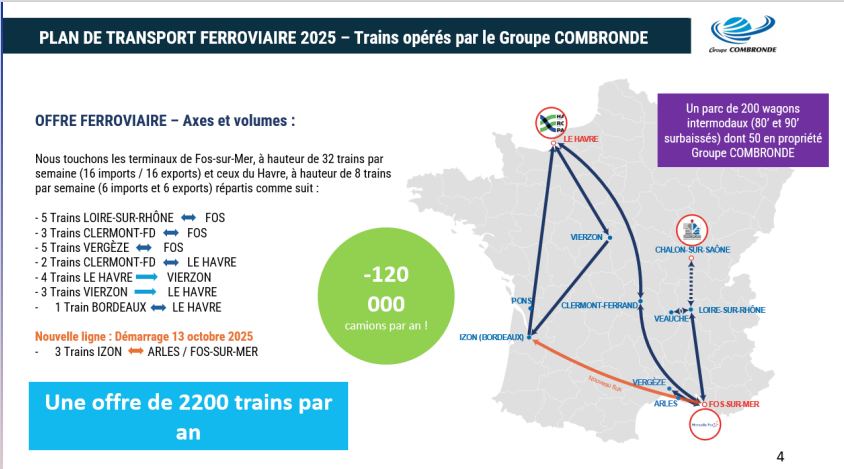 Initialement positionné sur le transport routier, le groupe Combronde est devenu un acteur majeur du ferroutage, avec plus de 2 000 trains opérés chaque année. En Nouvelle-Aquitaine, le développement de liaisons ferroviaires comme Bordeaux–Arles illustre une approche intégrée, combinant rail pour la longue distance et route pour les pré et post-acheminements.