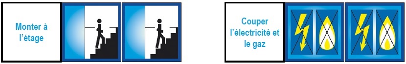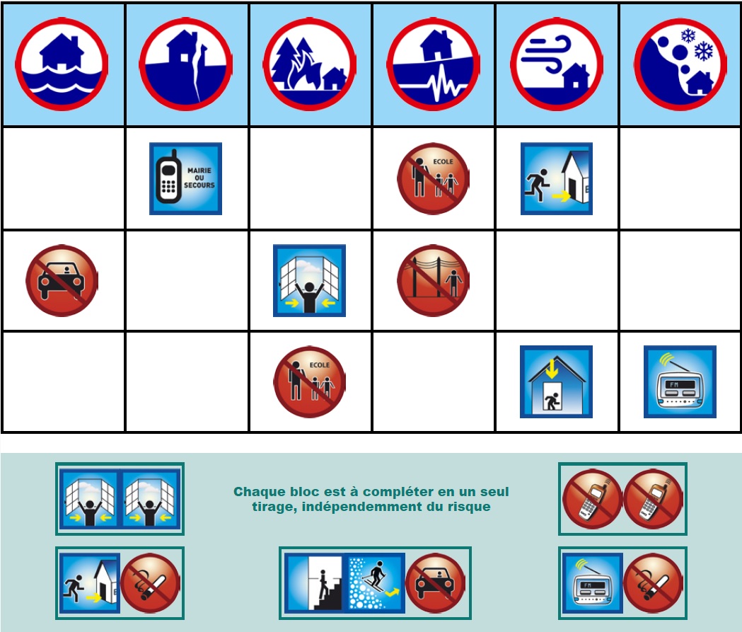 Jeu de dominos classique avec des visuels représentant les consignes de sécurité à adopter en cas d’inondation.